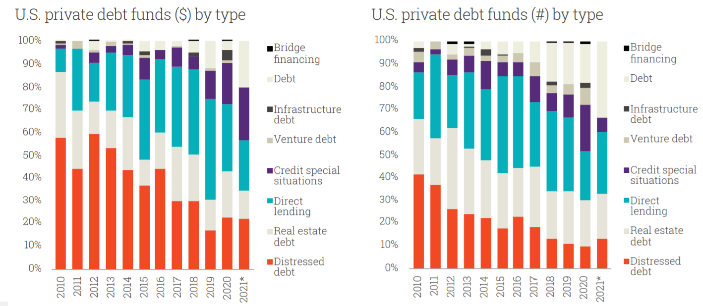 첫번째 그래프에도 보여지고 있지만 리스크의 크기는 Direct Lending > Mezzanine > Distressed Debt 입니다.