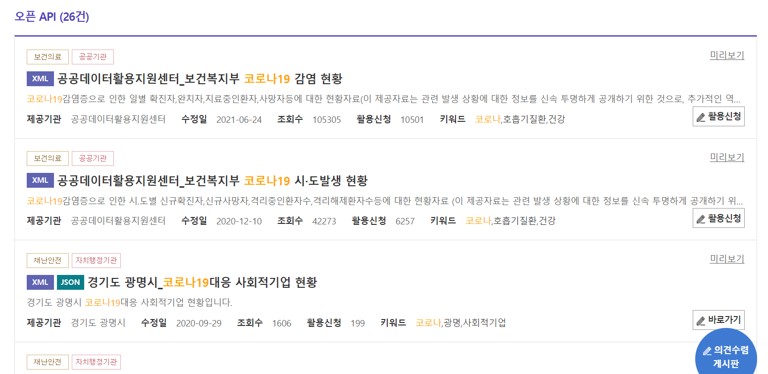 현재 무료로 사용가능한 오픈API를 제공하는 사이트를 모아 보았습니다. 각 사이트별로 기관의 특성이 반영되어 있긴 하지만 범위가 굉장히 다양해서 범위정리를 하는 건 의미가 없어보여, 사이트 목록과 검색결과 예시를 붙였습니다.