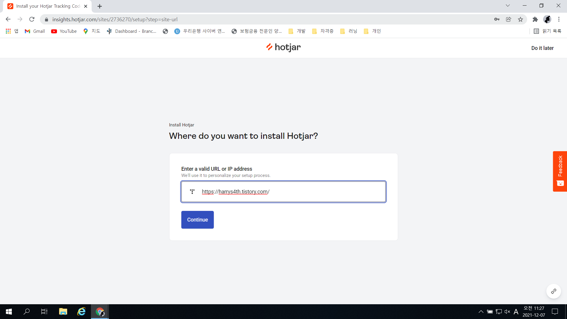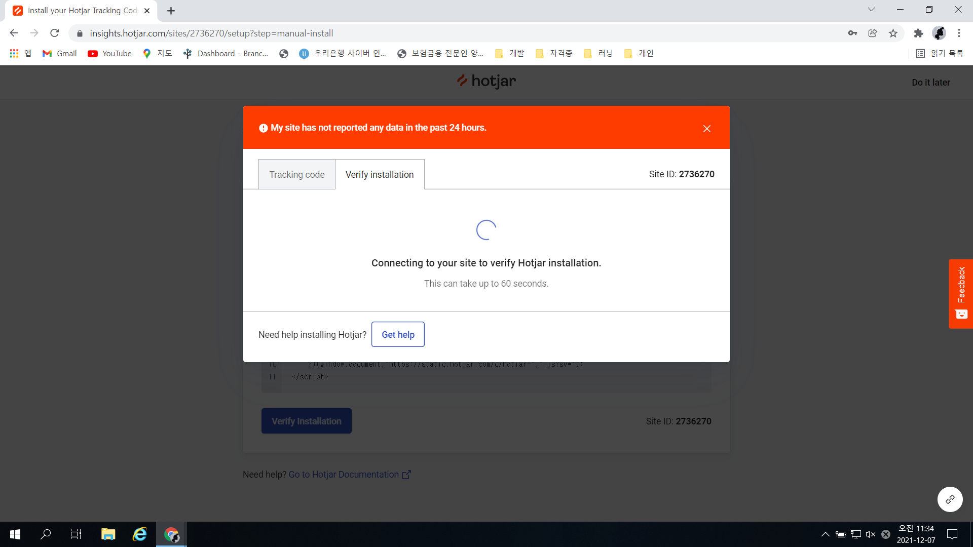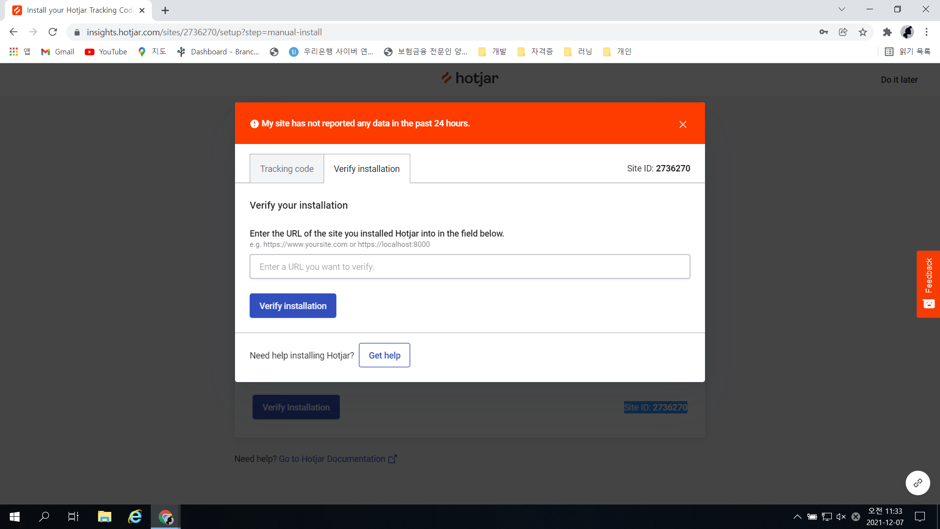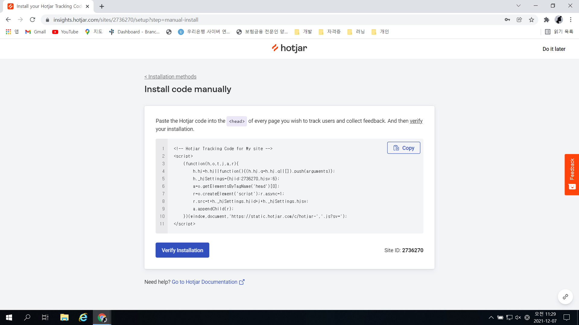 13. https://insights.hotjar.com/sites/2736270/dashboard 와 같은 별도의 관리페이지가 생성되고 중간의 숫자는 8번째 단계에서 나온 Site ID입니다.