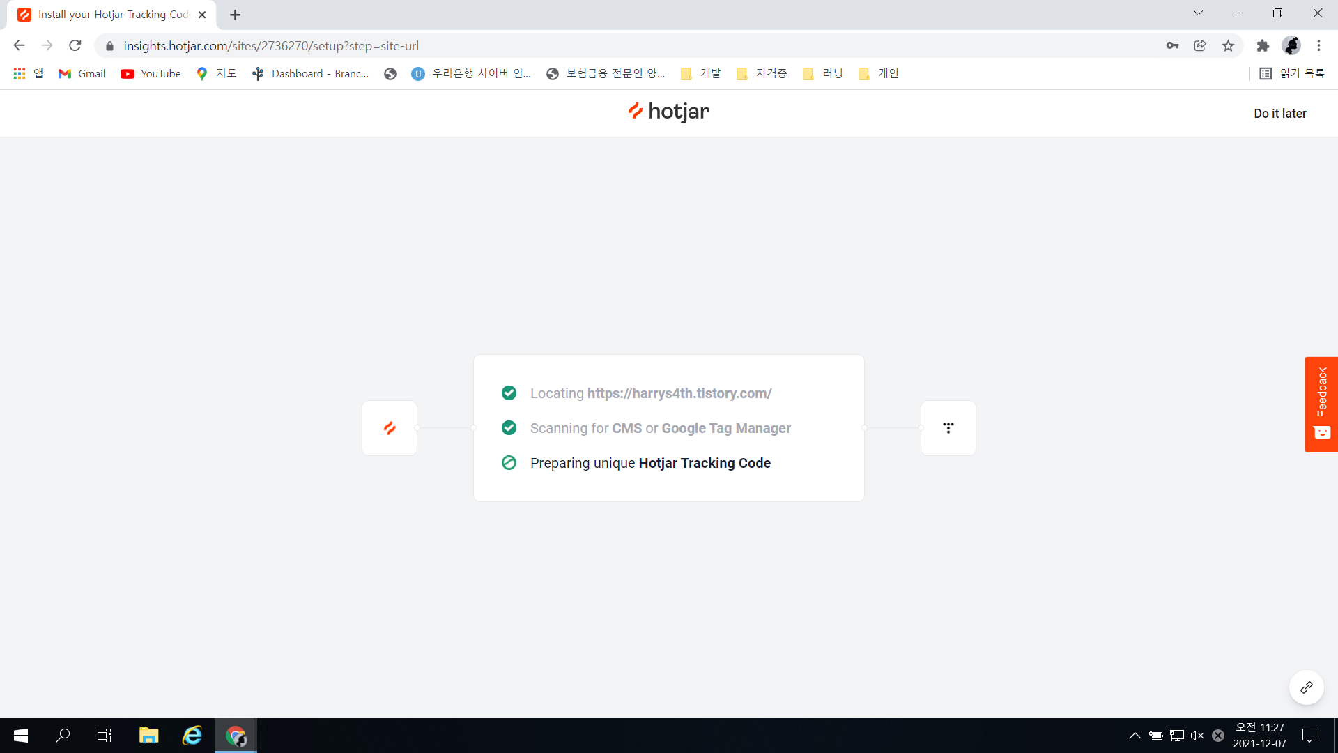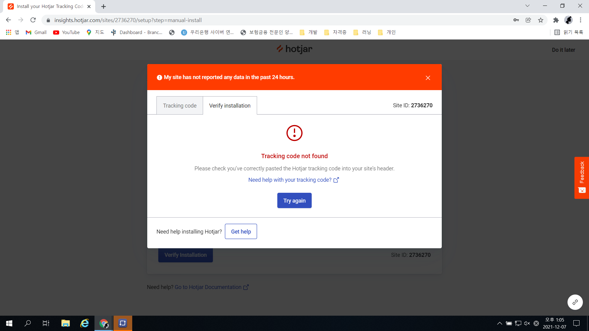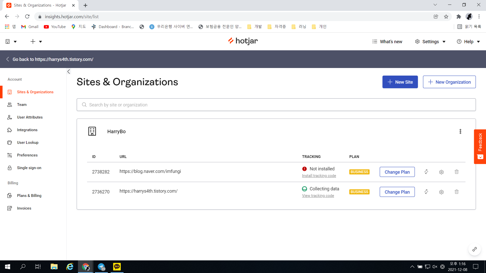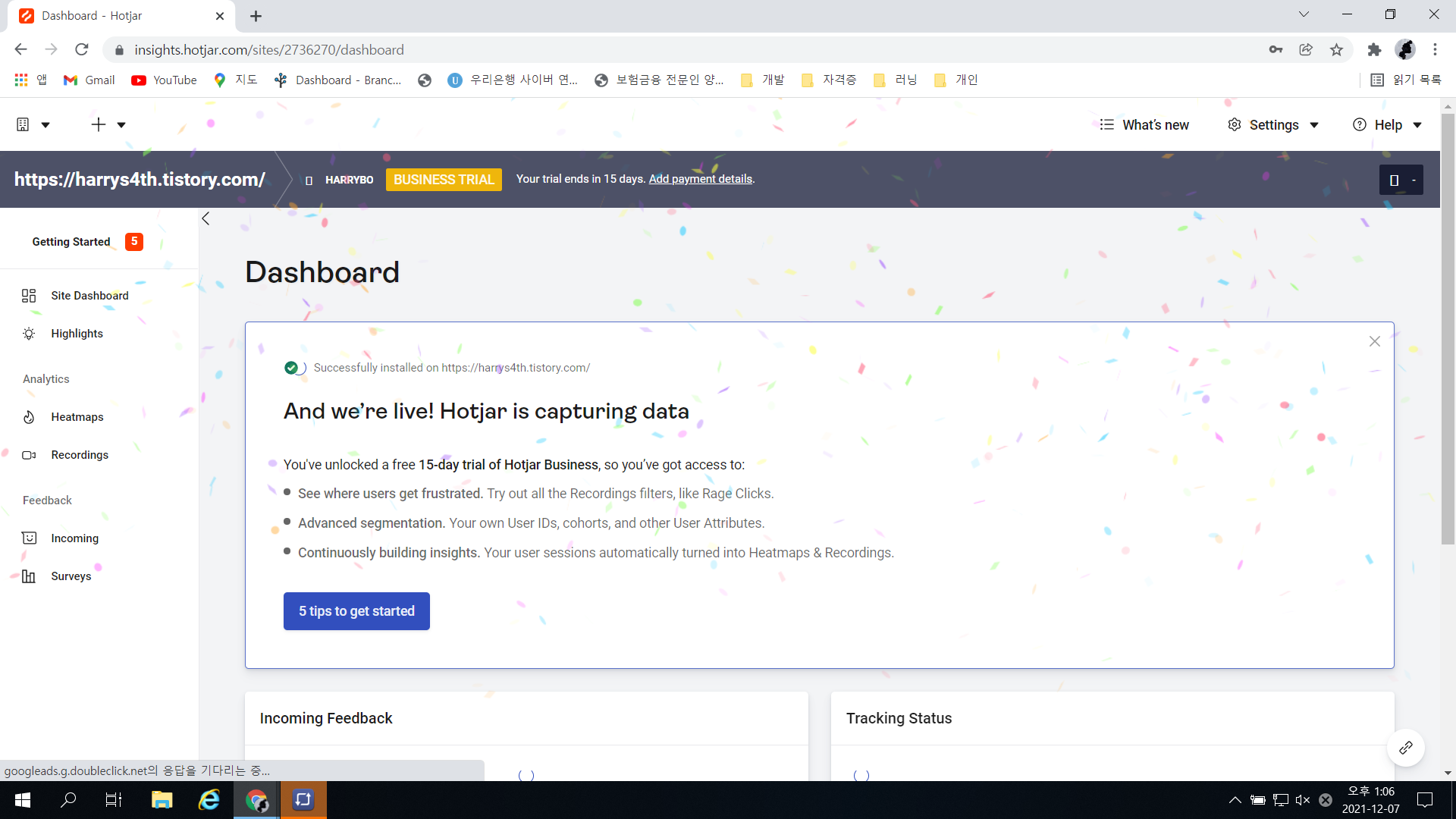 13. https://insights.hotjar.com/sites/2736270/dashboard 와 같은 별도의 관리페이지가 생성되고 중간의 숫자는 8번째 단계에서 나온 Site ID입니다.