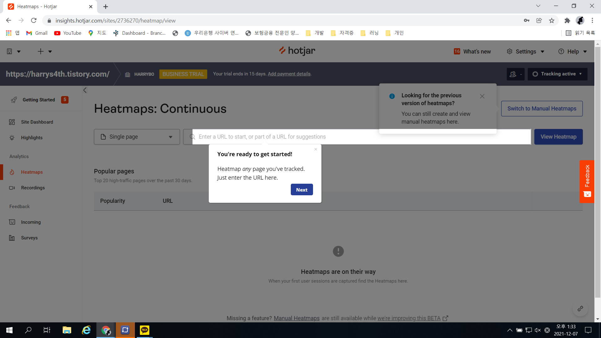 14. 관리페이지 좌측의 Heatmap을 클릭하면 첫사용자의 경우 아래와 같이 주소를 넣으라는 안내가 나옵니다.