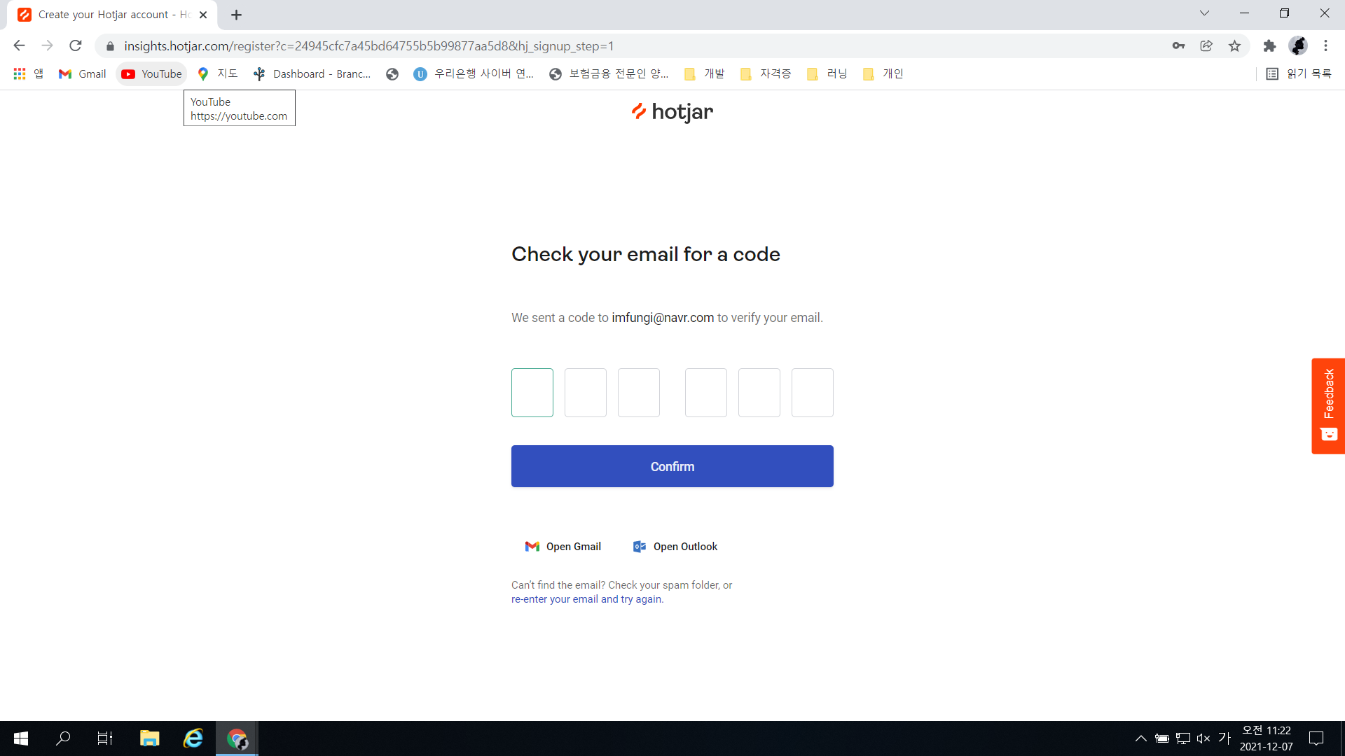3. 모든 정보를 넣고 Get started를 누르면 아래와 같이 메일로 받은 6자리를 넣으라는 화면이 뜹니다.
